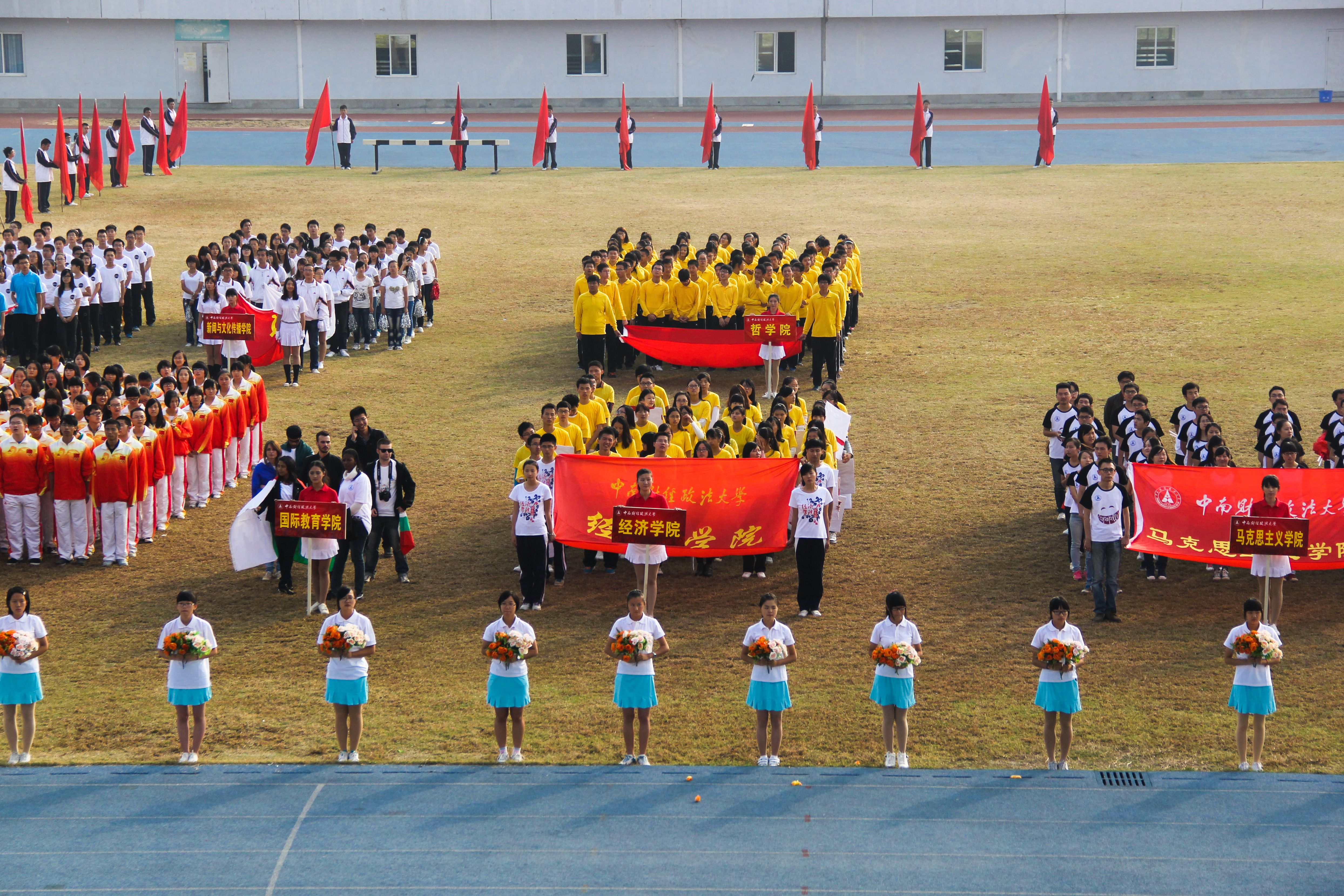 伴随着雄壮的《运动员进行曲》,首先进场的是国旗方队,进场的八名同学身着军装,头戴军帽,气宇轩昂,威风凛凛,精神高涨,他们迈着刚毅的步伐从主席台前缓缓走过,他们身上体现的正是中南财大学子独特的精,气,神。紧随其后的是本次运动会的花束队,她们身穿蓝裙白衣,那是天空的颜色,更是中南财大自由的生活氛围的象征,在晨光的映照下,她们的身影愈发生动。当整齐的脚步声响彻蓝天时,观众们沸腾了,雷鸣似的掌声震耳欲聋,许久之后才停息。当红旗卫队出现在众人的眼中,那鲜红的颜色感染了在场的每一个人,自己仿佛遭遇化身为旗,迎风飘扬,努力地开阔进取。